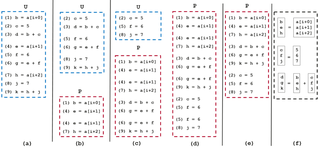 (1)对于原始循环 a,既可以通过 scalar expansion (a method of converting scalar data to match the dimensions of vector or matrix data.) 和 loop fission (the opposite of loop fusion: a loop is split into two or more loops. ) 后被转换为可以进行循环向量化的形式 b,一个induction和一个reduction;也可以经过unroll和rename之后变为 d 这样的形式,做SLP。但其实由于论文比较老了,目前llvm编译器对于a这样形式的循环可以直接做矢量化。
