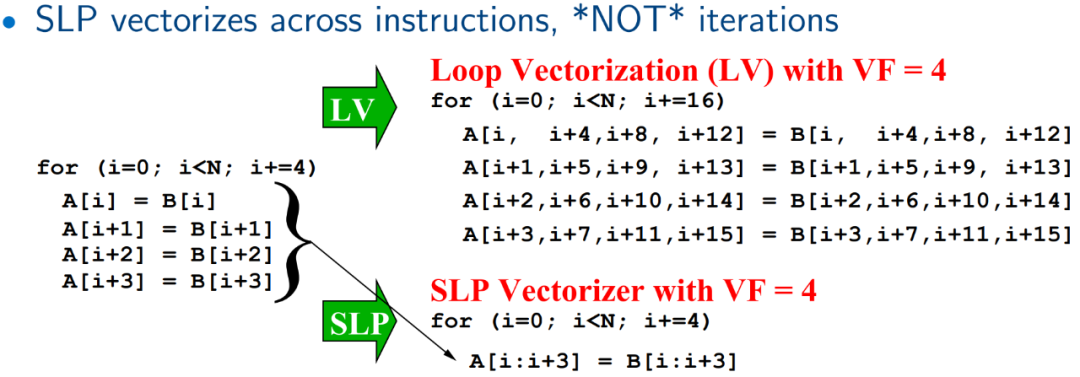 最后以一个例子来总结,SLP和循环矢量化的差异[6]: