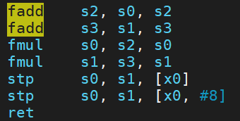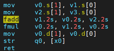 命令:clang++ case.cpp -O3 -S ;SLP在clang中是默认使能的,可以看到汇编中已出现使用矢量寄存器的fadd和fmul。