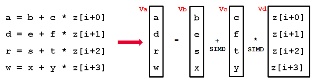 这四条语句中的位置相对应的操作数,比如(b,e,s,x)可以pack到一个向量寄存器 Vb 中,同样的,(c,f,t,y)可以pack到 Vc,(z[i+0]~z[i+3])可以到 Vd。然后可以利用simd指令进行相应的矢量化计算。最后根据 Va 中 (a,d,r,w) 的被使用方式,可能还需要将他们从向量寄存器中load出来,称为unpack。