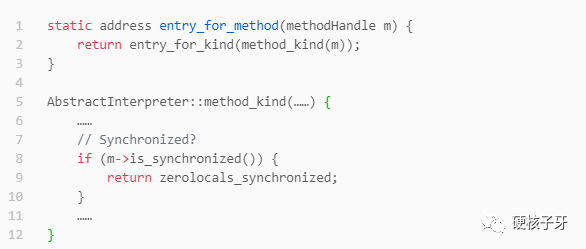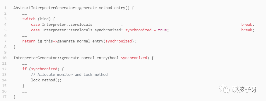 如果是synchronized修饰方法,在链接阶段绑定执行流zerolocals_synchronized。这两者的区别是什么呢?其实生成的执行流是同一套代码,区别就是有个判断,如果是synchronized修饰的方法,会执行lock_method。看代码。