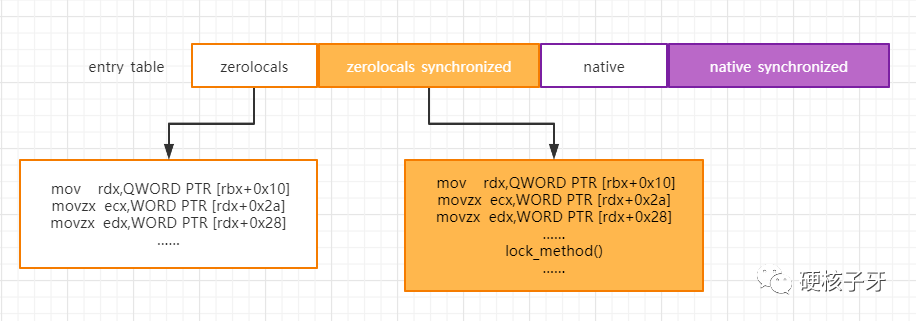 JVM中有很多entry point,都存储在entry table中。与方法调用相关的比较常见的是这四个。非native方法一般对应的就是前两个入口点,被synchronized修饰对应的是zerolocals_synchronized,否则是zerolocals。